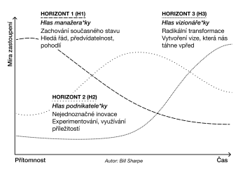 Převzato z článku Thinking in Three Horizons od Amandy Reeves.