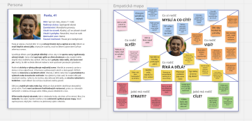 Výsledkem designového výzkumu se stala persona a empatická mapa. Na základě těchto vstupů jsme pak společně v týmu popisovali klíčové vhledy, které jsme si odnesli do další fáze procesu.