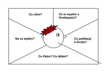- Nakreslete na flipchart obrázek podobný tomu výše a nadepište ho názvem pracovní pozice. Nezapomeňte na oči, nos a pusu, ať máte pořád na paměti, že je před vámi lidská bytost.