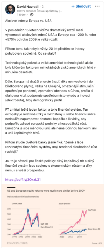 V dalším příspěvku, který vybudil mou zvědavost, sdílí David Navrátil graf vývoje výkonnosti akciových indexů v USA a Evropě a říká, že zdrojem mimořádných zisků amerického trhu v minulém desetiletí byl „technologický pokrok a technologické akcie“.