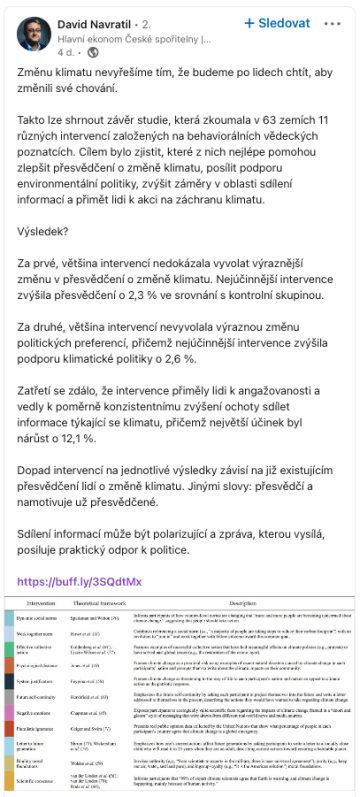 Hned v abstraktu jsem se dočetl: „Účinné omezení změny klimatu vyžaduje výraznou globální změnu chování. Není však jasné, které strategie s největší pravděpodobností motivují lidi ke změně jejich přesvědčení a chování o klimatu.“
