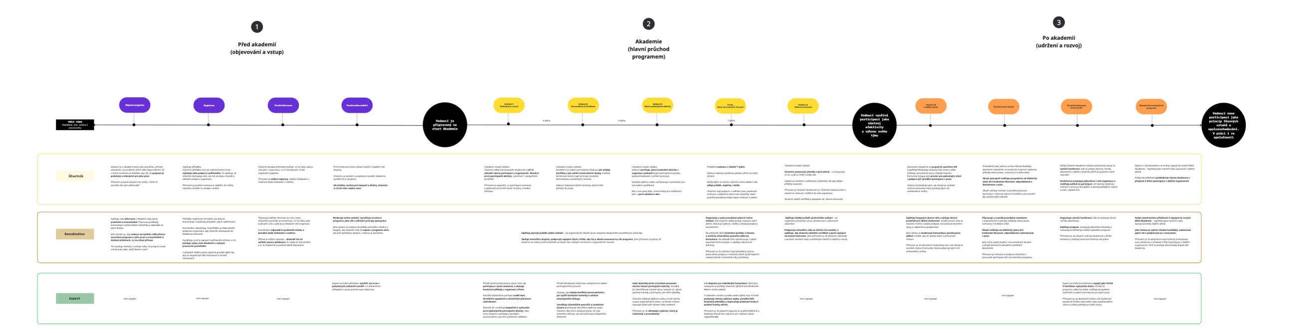 Na závěr jsme vybrali Akademii participace jako nejkomplexnější intervenci a rozpracovali ji do detailu. Využili jsme přitom principy designu služeb – zejména service blueprint, který nám umožnil zachytit celý průběh programu z pohledu různých aktérů. Mapovali jsme tři klíčové fáze – každá měla svou klíčovou roli v cestě k dlouhodobé změně: