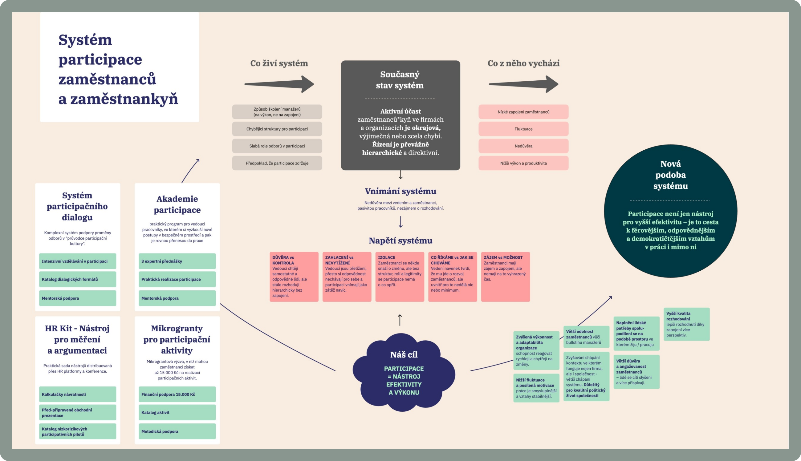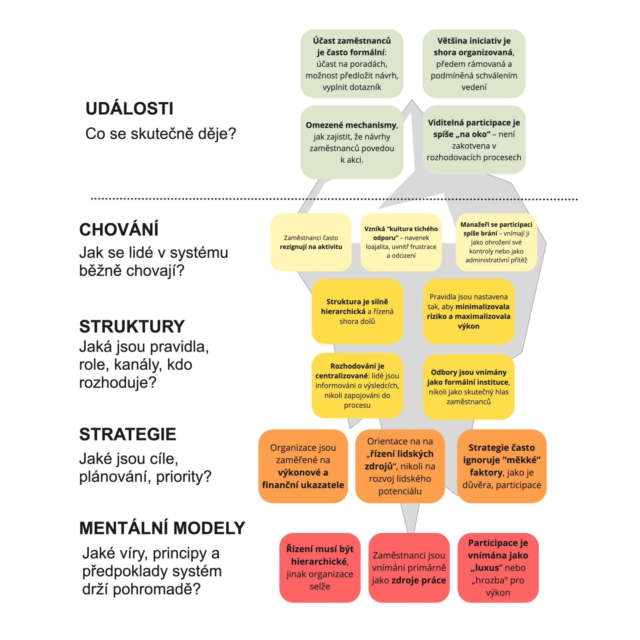 Fáze rámování, naslouchání a pochopení systému byla klíčová pro pochopení, proč participace v českých firmách a organizacích nefunguje tak, jak by mohla. Nesoustředili jsme se jen na viditelné následky, jako je nízká angažovanost nebo ztráta motivace, ale šli jsme hlouběji – k samotným příčinám a dynamice systému.