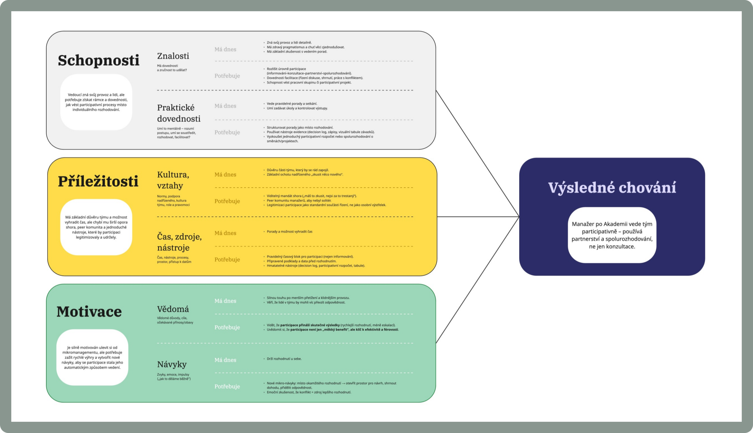 Akademie participace v detailu: model změny chování cílového publika, kompletní design služby, prodejní a komunikační materiály a cesta k pilotnímu spuštění.