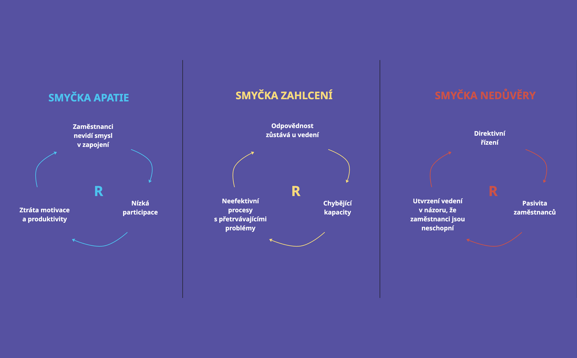Systémové smyčky – identifikovali jsme tři smyčky, které udržují současný stav: smyčka nedůvěry (direktivní řízení ↔ pasivita zaměstnanců), smyčka zahlcení (odpovědnost koncentrovaná u vedení ↔ chybějící kapacity) a smyčka apatie (nízký smysl zapojení ↔ nízká participace). Smyčky nám ukázaly, že bez zásahu do základní dynamiky systému nelze čekat skutečnou změnu.