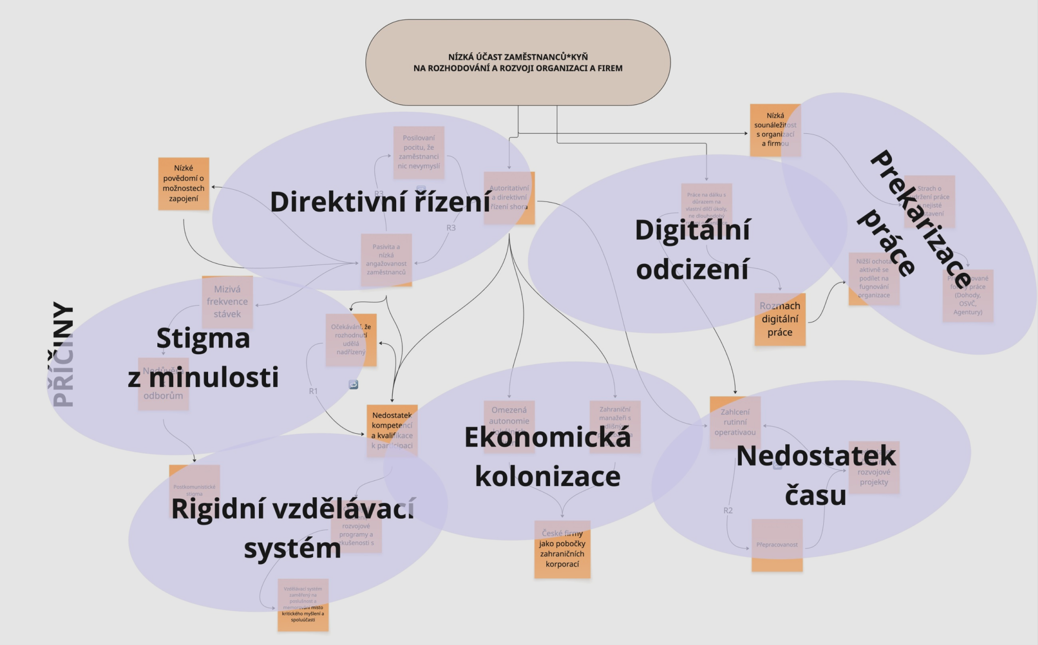 Analýza příčin – rozhovory, rešerše a interní workshop nám umožnily pojmenovat strukturální bariéry: direktivní řízení, stigma z minulosti, rigidní vzdělávací systém,prekarizace práce nebo nedostatek času.